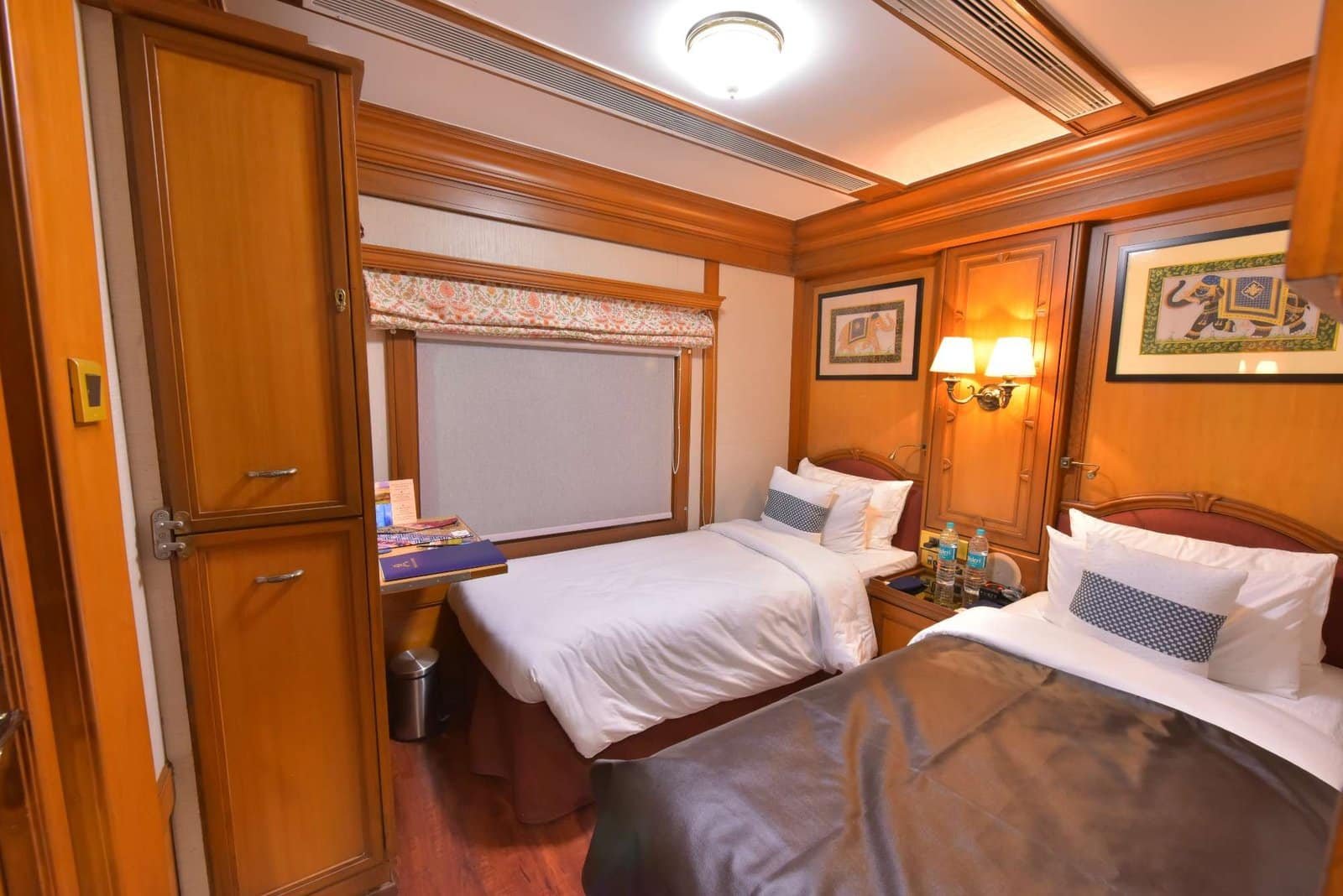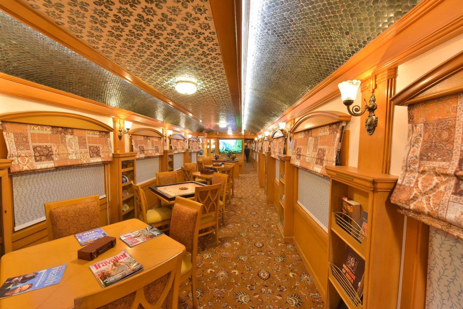 The Deccan Odyssey provides passengers with top-notch luxury in a fully air-conditioned train. The beautifully furnished Deluxe and Presidential Suite Cabins come with attached bathrooms and modern amenities, ensuring a lavish travel experience. Onboard, you’ll find a range of facilities including a Dining Car, Saloon, Bar Lounge, Mini Gymnasium, Conference Hall, and Ayurvedic Spa. This royal ride feels like a five-star hotel on wheels.